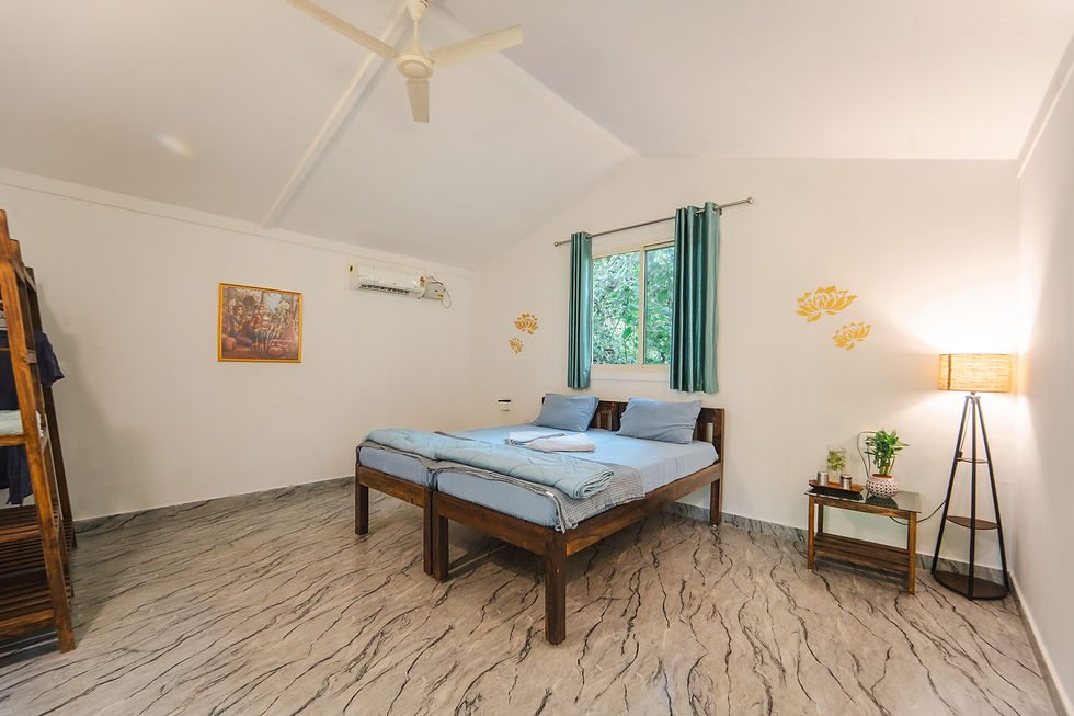 Inside, a generously sized double bed draped in fine mosquito netting and an additional guest bed ensure exceptional comfort. The space is cooled by discreet, modern AC and appointed with beautifully handcrafted wooden furnishings that reflect the natural charm of the retreat. An en-suite bathroom with a hot shower completes the experience, offering a luxurious yet nature-connected sanctuary for a deeply restful stay.